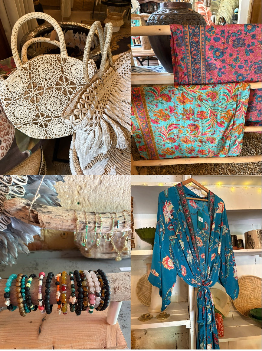 Une sélection de kimonos, foulards, bijoux et sacs.